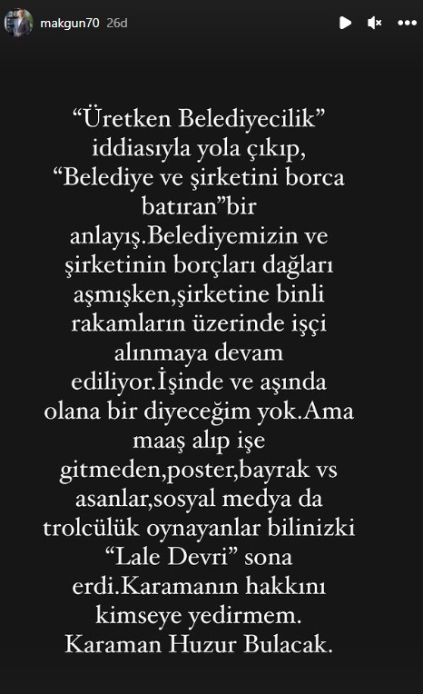 Akgün, yaptığı açıklamada belediyenin borç batağında olduğunu belirterek, hala şirketin işçi alımına devam ettiğini iddia etti. Özellikle belediyenin ve şirketinin borçlarının yüksek seviyede olduğunu vurgulayan Akgün, bu durumun sürdürülemez olduğunu ifade etti.Ayrıca, sosyal medya üzerinden algı operasyonları yapıldığını öne süren Akgün, sosyal medya trolcülerine de sert bir mesaj gönderdi. Akgün, "Üretken belediyecilik anlayışı ile yola çıkıp, belediye ve şirketini borca batıran bir anlayış. Belediyemizin ve şirketinin borçları dağları aşmışken, şirketine binli rakamlarının üzerine işçi alınmaya devam ediyor. İşinde ve aşında olana bir diyeceğim yok. Ama, maaş alıp işe gitmeden, poster, bayrak vs asanlar, sosyal medyada trolcülük oynayanlar biliniz ki 'Lale Devri' sona erdi. Karaman'ın hakkını kimseye yedirmem. Karaman huzur bulacak" şeklinde konuştu.Mevlüt Akgün'ün bu açıklamaları, Karaman'da siyasi ve idari gündemi oldukça hareketlendirdi. Akgün'ün sözleri, seçim sürecinde önemli tartışmalara neden olabilir.
