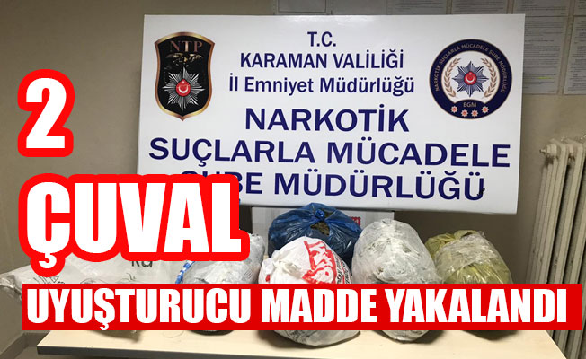 Karaman Narkotik Suçlarla Mücadele Şube Müdürlüğünce yapılan başarılı operasyonda 2 çuval içerisinde toplam 8 kilo 750 gram kubar esrar adı verilen uyuşturucu madde yakalandı.