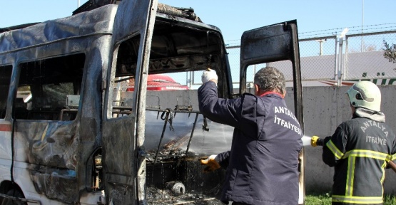 Antalya’da toptancı halinde işçileri taşımakta kullanılan park halindeki bir midibüs alev alev yandı. Aracı, babasıyla tartışıp, ‘o aracı yakacağım, siz de göreceksiniz’ diyerek evden çıktığı öğrenilen G.A.’nın yaktığı iddia edildi.Olay, Antalya’nın Kepez ilçesinde 11.00 sıralarında meydana geldi. Edinilen bilgiye göre, Antalya Sebze ve Meyve Toptancı Hali’nde 07 C 0905 plakalı servis midibüsünün alev aldığını gören çevredeki esnaflar, durumu 112 ve polis ekiplerine bildirdi. Bu arada vatandaşlar, yangın söndürme tüpleriyle midibüsü söndürmeye çalıştı ancak başaramadı. Bir müddet sonra olay yerine gelen Antalya Büyükşehir Belediyesi itfaiye ekipleri aracı kısa sürede söndürdü. Yangında can kaybı yaşanmazken, hal işçilerini taşıdığı öğrenilen servis midibüsü kullanılmaz hale geldi.Araç söndürülürken olay yerinde bulunan midibüs sahibinin oğlu G.A. ise gazetecilere tepki göstererek "Bana sormayın, başkasına sorun. Ağzım küfürlüdür, küfrederim" dedi. G.K., polis tarafından ifadesi alınmak üzere polis merkezine götürüldü."O aracı yakacağım, siz de göreceksiniz"Öte yandan aracı, servis midibüsünün sahibi D.A.’nın oğlu G.A.’nın yaktığı iddia edildi. Sabah saatlerinde babası ile tartışan G.A., yine iddiaya göre evden ‘o aracı yakacağım, siz de göreceksiniz’ diyerek ayrıldı. Aile ise durumu polis ekiplerine bildirerek oğullarının aracı yakacağını ihbar etti. Harekete geçen polis, olay yerine geldiğinde yanmakta olan midibüsle karşılaştı.