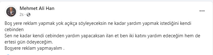 “Boş yere reklam yapmak yok açıkça söyleyeceksin ne kadar yardım yapmak istediğini kendi cebinden
