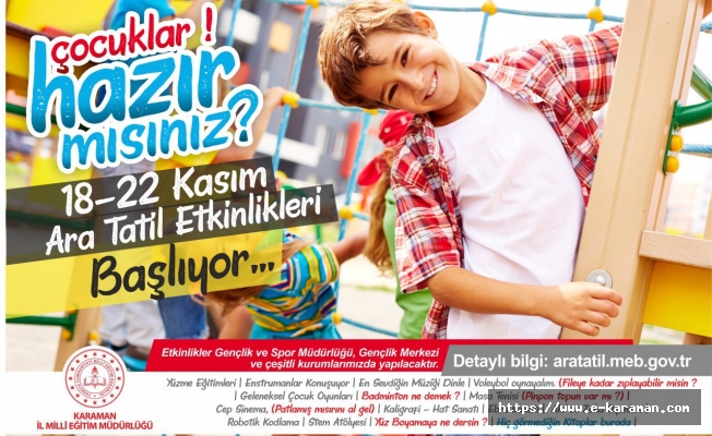 İlimizde gerçekleştirilecek etkinliklerle ilgili bilgi veren İl Milli Eğitim Müdürü Mehmet Çalışkan öğrencilerin on hafta süren eğitim öğretim sürecinin ardından bir haftalık ara tatil ile mola vereceklerini dile getirdi. Kültürden sanata, spordan doğaya, bilimden değerlerimize uzanan geniş bir yelpazede etkinliklerin planlandığını belirten İl Müdürü Mehmet Çalışkan “Öğrencilerimizin nitelikli bir dinlenme süreci yaşamaları için Gençlik ve Spor İl Müdürlüğümüz başta olmak üzere kurumlarımızla iş birliği içerisinde gerçekleştirilecek etkinlik planlamaları yaptık.” dedi.