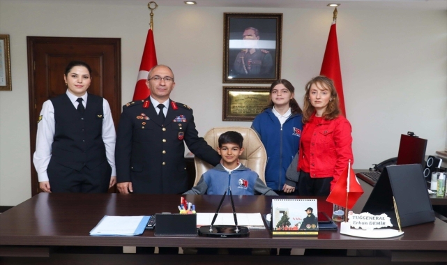 Eskişehir İl Jandarma Komutanı Tuğgeneral Erhan Demir, 23 Nisan Ulusal Egemenlik ve Çocuk Bayramı ve jandarmanın kuruluşunun 185'inci yıl dönümü kutlamaları kapsamında öğrencilerle buluştu.Tepebaşı ilçesindeki Atatürk Ortaokulu'nda öğrenim gören 100 öğrenci, idareci ve sınıf öğretmenleriyle beraber İl Jandarma Komutanlığı'nı ziyaret etti.İl Jandarma Komutanlığı Aile İçi Şiddetle Mücadele ve Çocuk Kısım Amirliği koordinesinde gerçekleşen ziyarette, öğrencilerle bir araya gelen İl Jandarma Komutanı Tuğgeneral Demir, onlarla sohbet ederek jandarmanın çalışmaları hakkında bilgiler verdi.Patlayıcı Madde İmha Timleri (PAMİT) ve Olay Yeri İnceleme Timi, Çevre, Doğa ve Hayvanları Koruma Timi ve Trafik Şube Müdürlüğünce jandarmanın görevleri kapsamında öğrencilere bilgi verildi.Köpek unsuru operatörü refakatinde asayiş köpeği "Atak" öğrenciler için gösteri icra etti. İstihbarat Şube Müdürlüğü tarafından dron uçuşu gerçekleştirilerek Komando Bölük Komutanlığı tarafından zırhlı araç ve personelin teçhizatları ile birlikte öğrencilere jandarma komandonun tanıtımı yapıldı.Siber Şube Müdürlüğünce ise siber farkındalık, güvenli internet ve sosyal medya kullanımı, çocuklara yönelik internet ortamında suç ve suçtan korunma yöntemleri konularında bilgilendirme yapıldı.Öğrencilere görsel içerikli ve bilgilendirici afiş ve broşür dağıtıldı. Kadın astsubaylar tarafından çocuklara refakat edilerek hediye ve boyama kitabı dağıtıldı.