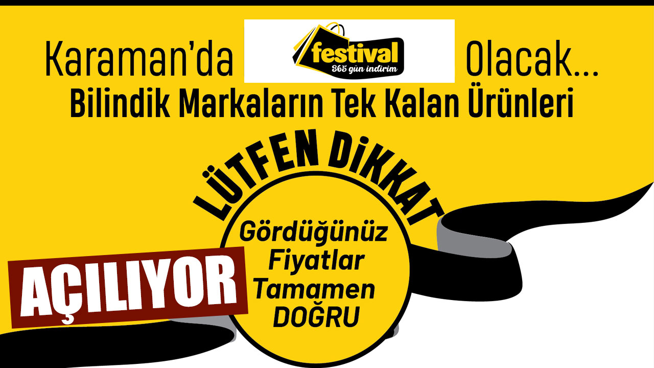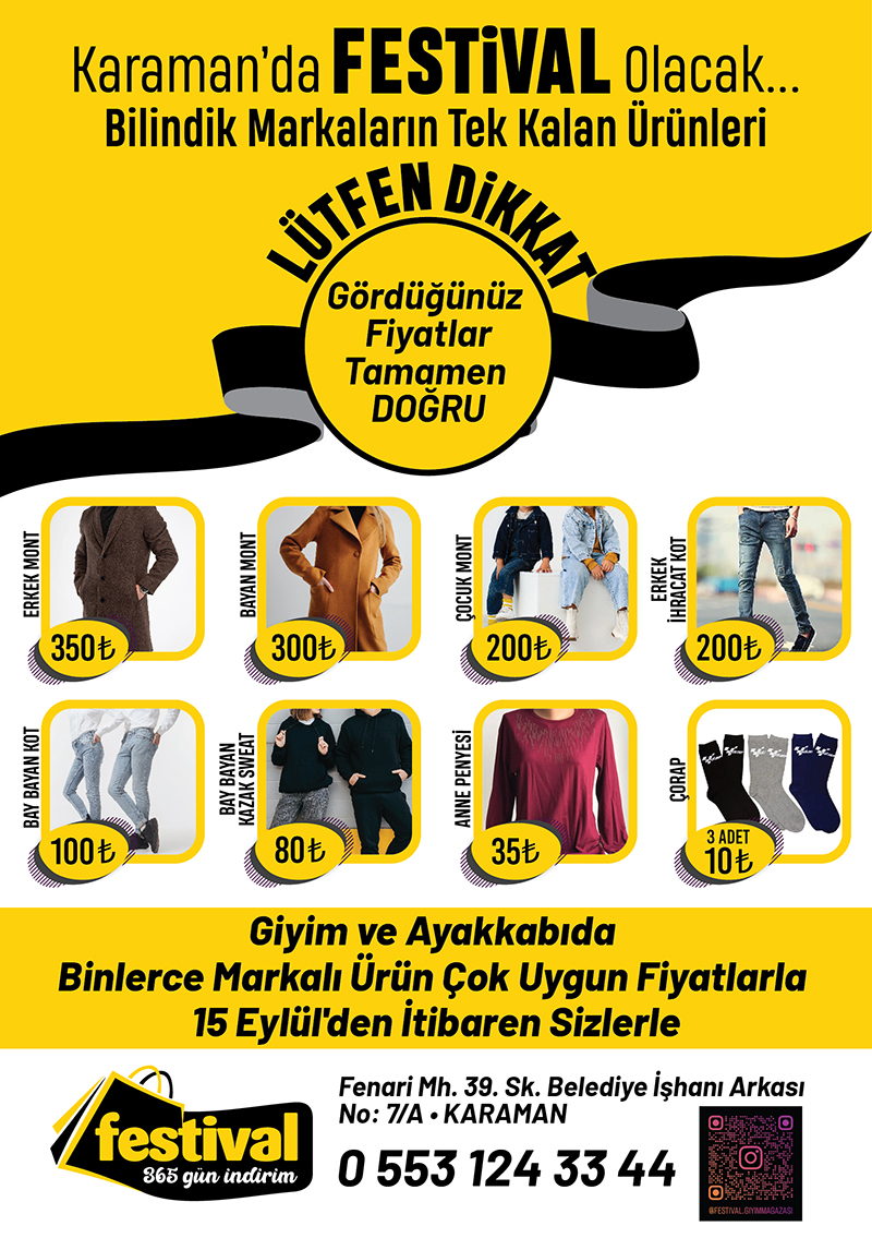 15 Eylül Cuma günü Açılacak olacak 365 Gün indirim slagonu ile hizmet verecek olan Festival Giyim Mağazası Fenari Mah. 39. Sok. Belediye İşhanı Arkası No:7/A adresinde hizmet verecek.