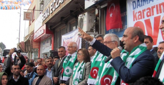 Ak Parti, 16 Nisan’da gerçekleşecek olan referandum için Gaziantep’in Araban ilçesindeki ‘Referandum Seçim Koordinasyon Merkezinin’ açılışını bugün yaptı.AK Parti Araban ‘SKM’ Seçim Koordinasyon Merkezi Açılışı için ilçeye gelen AK Parti Gaziantep İl Başkanı Mehmet Eyüp Özkeçeci, Gaziantep Büyükşehir Belediye Başkanı Fatma Şahin ve AK Parti Gaziantep Milletvekilleri Mehmet Erdoğan, Ahmet Uzer, Abdulkadir Yüksel, AK Parti Gaziantep eski milletvekili Gaziantep İl SKM Başkanı Mehmet Sarı ve beraberindeki heyet AK Parti Araban SKM önünde toplanan vatandaşlar tarafından davul zurna eşliğinde kurban kesilerek karşılanan heyet tarafından açılış yapıldı.İlçe merkezindeki Recep Tayip Erdoğan Parkı karşısındaki AK Parti Araban Seçim Koordinasyon Merkezi açılış konuşmasını yapan Araban Belediye Başkanı Mehmet Özdemir,’’16 Nisan günü yapılacak olan yeni Anayasa Referandumuna kadar ilçenin tümünü gece ve gündüz demeden karış karış gezerek Türkiye Cumhuriyetinin Yeni Anayasasını her vatandaşımıza tek tek anlatarak evet oyu isteyeceğiz’ ’dedi.AK Parti Gaziantep İl Başkanı Mehmet Eyüp Özkeçeci de yaptığı konuşmada, ’’Türkiye Cumhuriyetinin Yeni Anayasası için 16 Nisan tarihinde yapılacak olan referandum çalışmalarında ev ev gezerek yeni anayasayı vatandaşlarımıza tek tek anlatarak evet oyu isteyeceğiz’’ diye konuştu.AK Parti Hükumeti döneminde ilçeye yapılan hizmetlerden de bahseden Gaziantep Büyükşehir Belediye Başkanı Fatma Şahin, 16 Nisan da yapılacak olan yeni anayasa paketi için evet oyu istedi. Şahin konuşmasının devamında, ’’AK Parti olarak bu ülkede başbakan asan dönemi kapatacağız dedik, yeni Anayasa ile kapatıyoruz. AK Parti Hükumeti olmasa, AK Partinin milletvekilleri olmasa ben kimim ki tek başıma sizlere hizmet vereyim. AK Parti Hükumeti döneminde ilçeye yapılan hizmetlerden de bahsederek 16 Nisan da yapılacak olan yeni anayasa paketi için evet oyu istedi’’ ifadelerini kullandı.AK Parti Gaziantep Milletvekili Mehmet Erdoğan ise,’’Ardıl Barajında su tutumuna başlandığını su tutumu tamamlandığında Araban Ovasında 26 bin dönüme yakın kuru tarım yapılan arazilerde su tarıma geçilerek hem ülke hem de ilçe ekonomisine önemli katkı sağlanacağını belirterek Ardıl Barajının yapımına inanmayan muhalifler şimdide yeni anayasa referandumunda da hayır için çalışıyorlar onlara inanmayın. Çünkü onlar bir zamanlarda buraya gelip Ardıl Barajı yalan diye sizleri kandırmaya çalışmışlardı. Ardıl Barajı tamamlandı şimdi sıra Çat Boğazı ve Harmancık Barajlarında olduğunu söyleyen Erdoğan, Ardıl Barajı, Çat Boğazı Barajı ve Harmancık Barajları ile ilçede bir karış susuz tarım yapılan arazi kalmayarak tümünde sulu tarım yapılarak ülke ve ilçe ekonomisi kalkınacak. İşte bu hizmetler için 16 Nisan da yapılacak olan yeni anayasa referandumunda tüm Arabanlı hemşehrilerimin evet oyu kullanacağına inanıyorum’’diye konuştu.Açılış sonunda AK Partili heyete birer adet Araban Belediyesporun forması hatıra edildi.SKM Açılışından sonra AK Partili heyet Gaziantep Büyükşehir Belediyesi tarafından Dumlupınar Mahallesine yapılan Sosyal Tesisin açılışını da yaptı.
