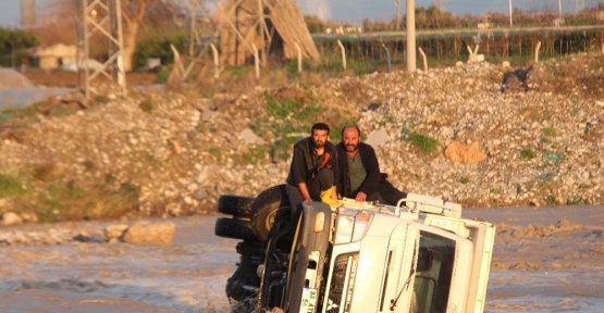 Mersin’de dere sularında akıntıya kapılarak sürüklenen kamyonette can pazarı yaşandı. Azgın suların devirdiği kamyonet üzerinde mahsur kalan biri Suriyeli 2 kişi, saatler süren çalışmalar sonrası vincin yardımıyla kurtarıldı.Edinilen bilgiye göre, Suriye uyruklu 30 yaşındaki Hasan Elfarac, yanında çiftçilikle uğraşan Mahmut Karakuş ile birlikte merkez Akdeniz ilçesine bağlı Çay Mahallesi’ndeki Deliçay deresinden 33 ATE 56 plakalı kamyonet ile karşıya geçmeye çalıştı. Ancak gece boyunca yağan yağmur dolayısıyla su seviyesi yükselen deredeki akıntı, kamyoneti sürüklemeye başladı. Derenin ortasında akıntıya kapılan kamyonet, bir süre sürüklendikten sonra devrilerek durabildi. Kamyonet sürücüsü Hasan Elfarac ile Mahmut Karakuş, camdan kamyonetin üstüne çıktı.İhbar üzerine önce olay yerine polis ve 112 ekipleri sevk edilirken, ardından kurtarma çalışmaları için Mersin Büyükşehir Belediyesi’ne ait itfaiye ekipleri çağrıldı. Ayrıca bölgeye suyun yüksek olması ve akıntının büyük olmasından dolayı vinçte sevk edildi. Yapılan değerlendirmenin ardından vinç dere içinden geçen ama suyla kaplı taş köprünün üzerinden 2 kişinin bulunduğu yere kadar gitti. Saatler süren kurtarma çalışmasının sonunda 2 kişi, vincin ucuna takılan halata bağlanarak kurtarıldı. Bu sırada herhangi bir aksaklığa meydan vermemek içinde Deniz Şube Müdürlüğü’ne bağlı 2 dalgıç polisi de dere içine girerek önlem aldı.Sağ salım karaya çıkarılan Suriye uyruklu Elfarac ile Karakuş, kontrol amaçlı hastaneye kaldırıldı. Mahmut Karakuş, daha öncede buradan geçtiğini belirterek, "Motorsikletimle karşıda bekliyordum. Karşıdan karşıya geçecektim. Arkadaştan rica ettim ve motoru kamyonetin arkasına koyduk. 10 metre gitmeden su aracı çekti, devrildik" dedi.Mahalle sakinleri de bu tür olayların daha öncede birçok kez yaşandığını, yetkililerin buraya köprü yapmasını istedi.