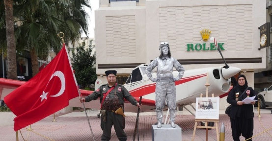 Adana’da, 8 Mart Dünya Kadınlar Günü etkinliklerinde uçak sürprizi yaşandı. Ziyapaşa Bulvarı Geliştirme ve Koruma Derneği, ’Türk Kadınına Saygı’ temalı kutlamada, bulvara tek pervaneli uçak yerleştirip, canlı mankenle ilk Türk kadın pilot Sabiha Gökçen’i andı.Davutlar Havacılık’ın bağışıyla Ziyapaşa Bulvarı’na getirilen tek pervaneli uçak, vinç yardımıyla bir iş yerinin önüne yerleştirildi. Kaldırıma konulan uçağın önünde dönemin pilot kıyafetini giyen, gümüş görünümlü canlı manken, ilk Türk kadın pilot Sabiha Gökçen’i tasvir etti. Türk Kadınına Saygı temalı kutlamada Kuvay-i Milliyeciler de Sabiha Gökçen’in fotoğrafının önünde ellerindeki Türk bayrağı ile nöbet tuttu. Bir kadın Kuvay-i Milliyeci, meraklı ziyaretçilere merhum Sabiha Gökçen’in fotoğraflı öz geçmişinin yer aldığı broşürler dağıttı.Dans grubu İtalyan rüzgarı estirdiGün boyu devam eden ’Türk Kadınına Saygı’ temalı etkinlikte 10 kişilik dans grubu Ziyapaşa Bulvarı, Şinasi Efendi Caddesi ve Mithat Saraçoğlu Caddesi’ni hareketlendirdi. Birbirinden renkli kostümleri ve makyajlarıyla kaldırımlarda boy gösteren dans grubu, Venedik dansları sergiledi.Ziyapaşa Bulvarı Geliştirme Derneği Başkanı Naci Sezgek, 8 Mart Çarşamba günü yapacakları etkinlikte de Kurtuluş Savaşı’nın kadın kahramanlarından Nene Hatun, Şerife Bacı, Halide Edip Adıvar, Halime Çavuş ve Adanalı Tayyare Halime Hanım’ı yine canlı mankenlerle tasvir edip anacaklarını söyledi.