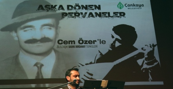 Çankaya Belediyesi Yılmaz Güney Sahnesi, "Aşka Dönen Pervaneler" projesi kapsamında bağlama sanatçısı Cem Özer’i sanatseverlerle buluşturdu.Çankaya Belediyesi Yılmaz Güney Sahnesi, "Aşka Dönen Pervaneler" projesi kapsamında bağlama sanatçısı Cem Özer’in Tokat Zileli Aşık Sadık Doğanay türkülerini seslendirdiği etkinliğe ev sahipliği yaptı.Bir aşık üzerinden okumalar ve araştırmalar yaparak kıyıda köşede kalmış hak ettiği değeri görememiş aşıklara vefa örneği gösterilmesi planlanan proje kapsamında ilk dinletiyi memleketlisi Sadık Doğanay’ın eserleriyle gerçekleştiren Cem Özer, dinletilerin aylık periyotlar halinde devam edeceğini söyledi.Müzik kariyerini 2006 yılından bu yana Boğaziçi Gösteri Sanatları Topluluğu ile sürdüren Özer, 300’e yakın bestesi 800’e yakın repertuvarı bulunan Sadık Doğanay’a hak ettiği değeri hiç olmazsa öldükten sonra vermenin gururunu yaşadığını belirtti.Çanakkale Onsekiz Mart Üniversitesi Eğitim Fakültesi Müzik bölümünü bitirdikten sonra yüksek lisansını Haliç Üniversitesi Sosyal Bilimler Enstitüsü Türk Musikisi bölümünde ’Zileli Aşık Sadık Doğanay’ın Hayatı, Sanatı ve Sanatçı Kişiliği’ adlı tez çalışmasıyla tamamlayan Özer; repertuvarları arasında ‘El vurup yaremi incitme tabip’ ve ‘Nasıl yar diyeyim ben böyle yare’ gibi 14 parçalık Sadık Doğanay dinletisi ile izleyenlere keyifli bir gece yaşattı.