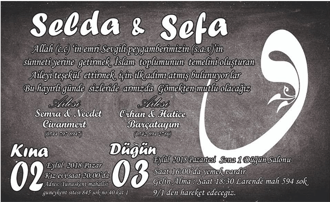 Orhan Giyim Mağazaları sahiplerinden olan Orhan Hatice Barçatayım ailesinin oğlu Sefa Barçatayım ile Necdet Semra Civanmert ailesinin kızı Selda Civanmert ile Sena 1.Düğün salonunda gerçekleştirilecek olan düğünle dünya evine girecek.Yemek 03.09.2018 tarihi yani bugün saat 16.00'da Larende Mahallesi 594. sokak No:9 önünde verilecektir.Gelin Alma saat 18.30'da Larende Mahallesin'deki evden hareket edecektir.Bu Mutlu günümüze bütün sevenlerimizi, dostlarımızı bekliyoruz.