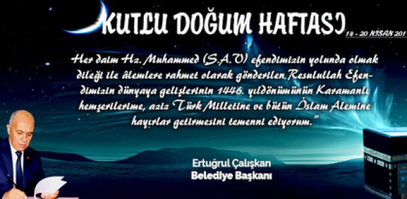 Karaman - Karaman Belediye Başkanı Ertuğrul Çalışkan, Peygamberimiz Hz. Muhammed (S.A.V.) Efendimizin dünyaya gelişlerinin 1446. yıldönümü nedeniyle her yıl 14-20 Nisan tarihleri arasında kutladığımız Kutlu Doğum Haftası nedeniyle bir mesaj yayımladı.