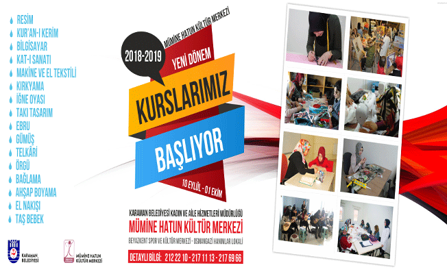 Karamanlı kadınların büyük ilgi gösterdiği spor aktiviteleri ve kurs faaliyetleri olan merkezlerde yeni dönem kurs kayıtları başlıyor.Halk Eğitim Merkezi Müdürlüğü işbirliği ile açılacak olan kurslara kayıtlar, 10 Eylül 2018 ve 01 Ekim 2018 tarihleri arasında yapılacak. Mümine Hatun Kültür Merkezi’nde; Resim, Kur’an-ı Kerim, Bilgisayar, Kat-ı Sanatı, Makine ve Ev Tekstili, Kırkyama, İğne Oyası, Takı Tasarım, Ebru, Gümüş Telkari, Örgü, Bağlama, Ahşap Boyama, El Nakışı (Keçe) ve Taş Bebek (Taş Boyama Sanatı ), Beyazkent Spor ve Kültür Merkezi’nde; Makine ve Ev Tekstili ve İğne Oyası, Osmangazi Hanımlar Lokali’nde; Makine ve Ev tekstili, İğne Oyası ve Giyim dallarında açılacak kurslara katılmak isteyen kadınlar, Mümine Hatun Kültür Merkezi, Beyazkent Spor ve Kültür Merkezi, Osmangazi Hanımlar Lokali’ne başvurabilecekler.Kurslar hakkında detaylı bilgi almak isteyenler, Mümine Hatun Kültür Merkezi’nin 212 22 10, Beyazkent Spor ve Kültür Merkezi’nin 217 11 13, Osmangazi Hanımlar Lokali’nin 217 69 66 numaralı telefonlarını arayabilecekler.