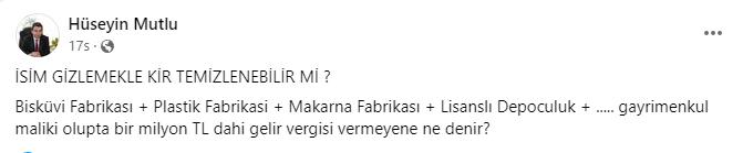 Karaman'ın tanınmış avukatlarından olan Hüseyin Mutlu, Vergi Rekortmenleri açıklamasının ardından sosyal medya hesabından sert bir paylaşımda bulundu. Mutlu, vergi ödememekle suçladığı kişilere yönelik çarpıcı ifadeler kullandı.Sosyal medya hesabından yaptığı paylaşımda Mutlu, şu sözleri kullandı: "İSİM GİZLEMEKLE KİR TEMİZLENEBİLİR Mİ? Bisküvi Fabrikası + Plastik Fabrikası + Makarna Fabrikası + Lisanslı Depoculuk + ..... gayrimenkul maliki olup bir milyon TL dahi gelir vergisi vermeyene ne denir?"