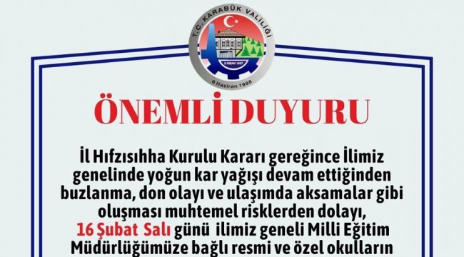 Karabük Valiliği kar yağışı nedeniyle kentte yüz yüze eğitimin 16 Şubat'ta da ertelendiği duyurdu.