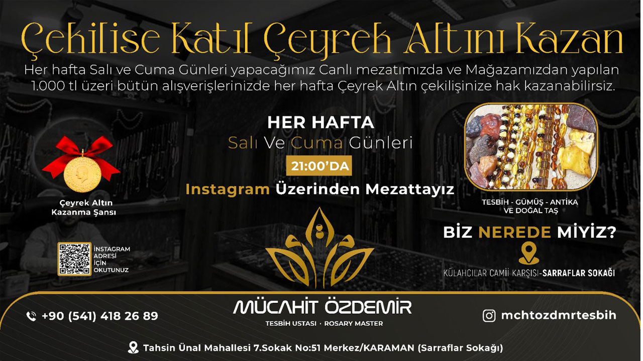 Karamanda tesbih ustası Mücahit Özdemir, elinde bulunan ürünleri canlı yayında bir bir tanıtıp, bunları açık artırmaya çıkartıyor. Müzayedede en yüksek teklif mesajı atan, ürünün sahibi oluyor.Özdemir ayrıca, her hafta Salı ve Cuma günleri canlı mezat şeklinde sunduğu açık artırma satış yoluyla takipçilerine çeyrek altın kazanma fırsatı da sunuyor.Karaman merkez Tahsin Ünal Mahallesi Külahçılar Cami Sarraflar sokağında işyeri bulunan Özdemir, ınstgram üzerinden sunduğu canlı mezat programı bu akşam saat 21 de başlıyor.İlgililerin rağbet göstermesi beklenen canlı yayın mezat satışları ile haftanın iki günü mağazadan yapılan 1000 TL ve üzeri alışverişlerde de çeyrek altın çekiliş hakkı bulunuyor.