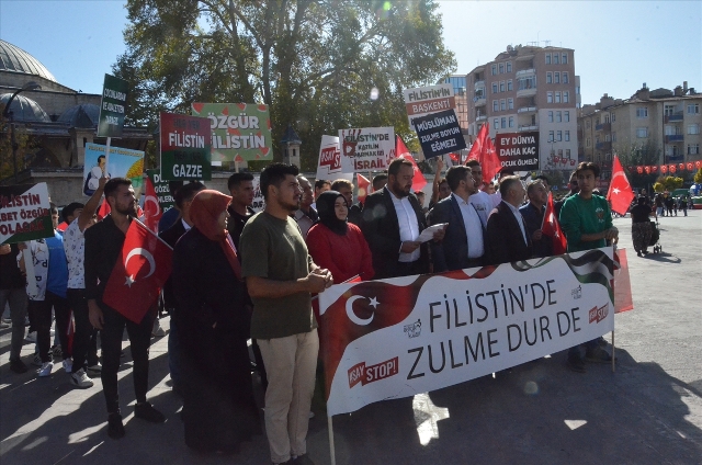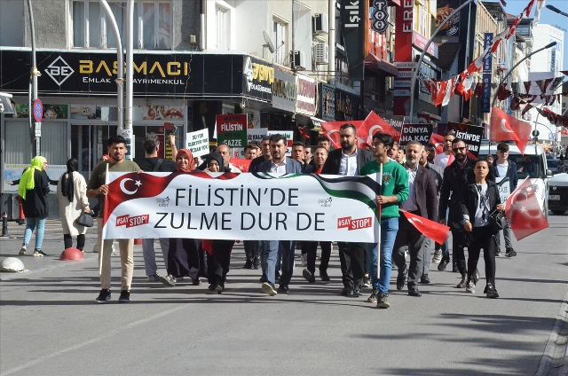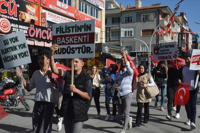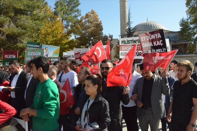 "Filistin'in başkenti Kudüs'tür", "Ey dünya daha kaç çocuk ölmeli?", "Her yer Filistin her yer Gazze" yazılı pankartlar taşıyan grup, tekbir getirerek ve İsrail aleyhine sloganlar atarak Aktekke 15 Temmuz Demokrasi Meydanına geldi.