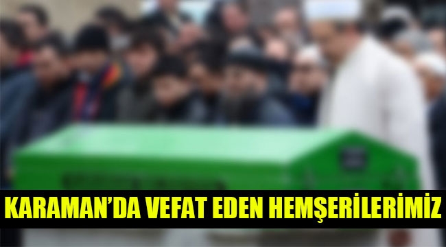 Kemal Kolyiğit 66 yaşında vefat etti. Cenazesi öğle namazına mutakiben musalladan kaldırılacak. (normal ölüm) Aslen Ermenek’li olup yurtdışında ikamet etmekte olan Sebahattin Varış 40 yaşında vefat etti. Cenazesi öğle namazına mutakiben musalladan kaldırılacak.(normal ölüm) Aslen Ada köyünden olup Tapucak mahallesinde İkamet etmekte olan Süleyman Taşpınar 85 yaşında vefat etti. Cenazesi öğle namazına mutakiben musalladan kaldırılacak. (covid-19 sonucu ölüm) Aslen Karaman’lı olup Gazidükkan mahallesinde ikamet etmekte olan Mahmut Öğmen 52 yaşında vefat etti. Cenazesi öğle namazına mutakiben musalladan kaldırılacak. (covid-19 sonucu ölüm) Aslen Karaman’lı olup Beyazkent mahallesinde ikamet etmekte olan Cemile Kahve 37) yaşında vefat etti Cenazesi ikindi namazına mutakiben siyaser mezarlığından kaldırılacak. (normal ölüm) Aslen Karaman’lı olup Cumhuriyet mah ikamet etmekte olan Sabit Işıkaltun 68 yaşında vefat etti. Cenazesi öğle namazına mutakiben musalladan kaldırılacak. (covid-19 sonucu ölüm) Merhum ve merhumelere Allah'tan rahmet aileleri ve yakınlarına başsağlığı dileriz.