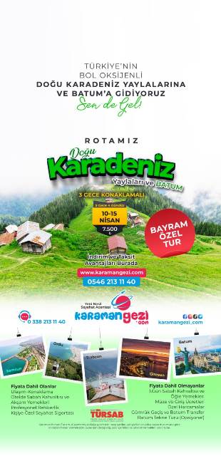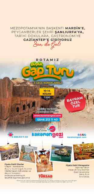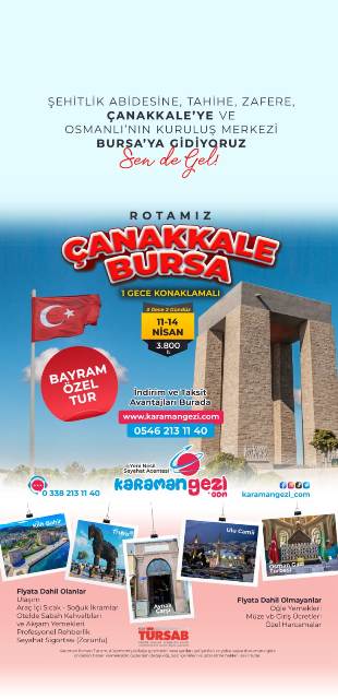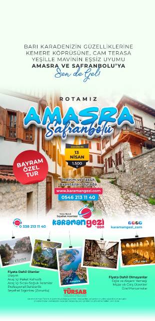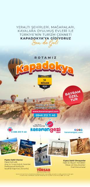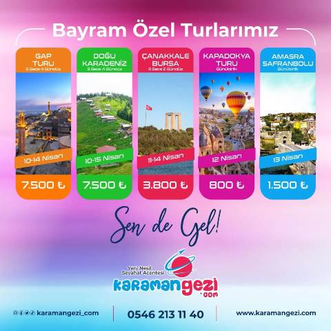 Bayram Tur TakvimiKaraman Gezi'nin sunduğu Bayram özel turları kapsamında birbirinden ilginç rotalar yer alıyor. Tatilciler, tur takviminde yer alan destinasyonlardan kendilerine en uygun olanı seçerek unutulmaz bir bayram tatili geçirebilirler. KaradenizKaradeniz'in mistik atmosferini keşfetmek isteyenler için özel olarak düzenlenen turlar, doğanın ve tarihin iç içe geçtiği muhteşem rotalar sunuyor. Yeşilin ve mavinin buluştuğu bu coğrafyada unutulmaz anılar biriktirebilirsiniz. GAPGüneydoğu Anadolu'nun eşsiz güzelliklerini keşfetmek isteyenler için Güneydoğu Anadolu Projesi (GAP) bölgesinde düzenlenen turlar kaçırılmayacak fırsatlar sunuyor. Tarihi zenginlikleriyle ünlü bu bölgede unutulmaz bir kültür turuna çıkabilirsiniz.Çanakkale - BursaTarih kokan Çanakkale ve yeşilliklerle bezeli Bursa'yı aynı turda keşfetmek isteyenler için özel olarak düzenlenen turlar, hem tarihi hem de doğal güzellikleri bir arada sunuyor. Efsanelerin ve destanların diyarı olan bu coğrafyalarda geçmişle günümüzü buluşturan bir yolculuğa çıkabilirsiniz.KapadokyaPeri bacalarıyla ünlü Kapadokya'yı keşfetmek isteyenler için düzenlenen turlar, benzersiz coğrafyasıyla büyüleyici bir deneyim sunuyor. Tarihi dokusuyla göz kamaştıran bu bölgede balon turuna çıkabilir, yer altı şehirlerini gezebilirsiniz.AmasraKaradeniz'in incisi Amasra'yı keşfetmek isteyenler için düzenlenen turlar, doğanın cömertliği ve tarihin izlerini bir arada sunuyor. Denizin ve tarihin buluştuğu bu güzel ilçede unutulmaz bir tatil geçirebilirsiniz.Rezervasyon ve İletişim BilgileriBayram tatilini farklı rotalarda geçirmek isteyenler için Karaman Gezi'nin özel turları, www.karamangezi.com adresinden veya 0546 213 11 40 numaralı telefon ile rezerve edilebilir. Ayrıca detaylı bilgi almak için 0338 213 11 40 numaralı acenteye de başvurabilirsiniz.Bu bayram tatilinde farklı bir deneyim yaşamak isteyenler için Karaman Gezi'nin sunduğu özel turlar kaçırılmayacak fırsatlar sunuyor. Tatilciler, kendilerine en uygun turu seçerek keyifli bir tatilin kapılarını aralayabilirler.