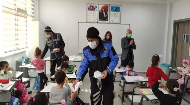 Kilis'te Toplum Destekli Polislik (TDP) Şube Müdürlüğü ekipleri, ilkokul birinci sınıf öğrencilerine maske kullanımı ile ilgili bilgilendirmelerde bulunarak, maske dağıtımı gerçekleştirdi.