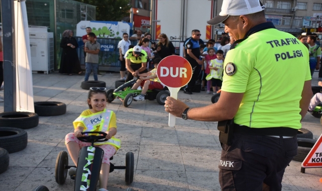 İl Emniyet Müdürlüğü Trafik Tescil ve Denetleme Şube Müdürlüğü ekipleri, Cacabey Meydanı'nda çocuklarda trafik bilincinin oluşması için etkinlik düzenlendi.