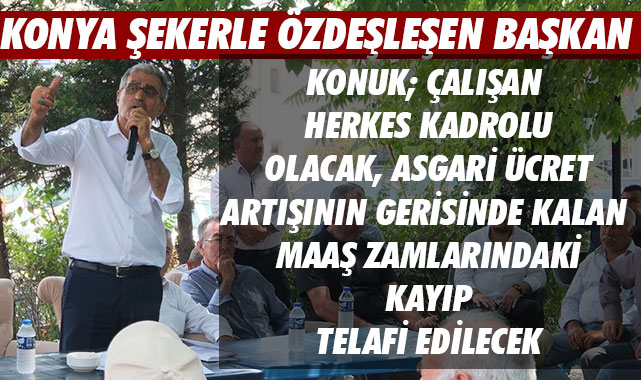 Recep Konuk, geldikleri anda her kampüsün yakınında çalışanlara yönelik konut projeleri yapacaklarını da söyledi. Konya Şeker’de yapılan zam konusuna da değinen Konuk, bu sene çalışanlara yönelik verilen zammın, asgari ücrette yapılan artış oranının bile gerisinde kaldığını belirterek, geldikleri anda çalışanların kaybını telafi edeceklerini, çalışanları enflasyona ezdirmeyeceklerini, Konya Şeker ve iştiraklerinde kadrosuz, sendikasız hiçbir personelin kalmayacağını, personelin de hak ettiği maaşı alacağını sözlerine ekledi.