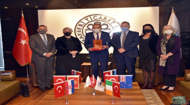 5 ülke ile 2020 yılında yapılan ihracat rakamları hakkında da bilgiler veren Başkan Gülsoy, Slovenya ile Türkiye toplam ticaret hacmi 1 milyar 960 milyon dolar, Kayseri ile ticaret hacmi 4 milyon 261 bin dolar, İrlanda ile Türkiye arasındaki toplam ticaret hacmi 1 milyar 504 milyon dolar, Kayseri ile ticaret hacmi 184 milyon dolar, Hırvatistan ile Türkiye arasındaki toplam ticaret hacmi 619 milyon dolar, Kayseri ile ticaret hacmi 5 milyon 380 bin dolar, Estonya ile Türkiye arasındaki toplam ticaret hacmi 240 milyon dolar, Kayseri ile ticaret hacmi 1 milyon 732 bin dolar, Yeni Zelanda ile Türkiye arasındaki toplam ticaret hacmi 135 milyon dolar, Kayseri ile toplam ticaret hacmi 670 bin dolar’dır. Bu ihracatımızın totalde yüzde 8’e yakınını bu 5 ülke ile yapıyoruz" diye konuştu.Kayseri’nin turizm yönünden zengin bir hazineye sahip olduğunun altını çizen Başkan Gülsoy, Büyükelçileri bu güzellikleri ülkelerinde de anlatmalarını talep etti. Başkan Gülsoy, 60 yıldır Avrupa Birliği’ne üye olmak için çalışmalarını sürdüren Türkiye’ye destek olmalarını beklediklerini sözlerine ekledi.BÜYÜKELÇİ SELİGO : TİCARET HACMİ RAKAMLARI DÜŞÜK, YÜKSELTECEĞİZZiyarette konuşan Slovenya Ankara Büyükelçisi Primoz Seligo ise “ Kayseri ile Slovenya arasındaki ticaret hacmi çok az. Benim görevim bu rakamı yükseltmek. Bizim Türkiye’de 9 fahri konsolosumuz var. Buradaki fahri konsolosumuzla Kayseri ile Slovenya arasındaki işbirliği alanlarını artırılabileceğini düşünüyorum. Slovenya olarak Kayseri’de sağlık turizmi konusunda bilgimizin olduğunu söyleyebilirim. Ağaç ve ağaç işleme ürünleri özellikle de kağıt ve kağıttan elde edilen ürünler. Bunlar bizim güçlü sektörlerimiz hem de Kayseri ile işbirliği yapabileceğimiz sektörler. Ticari ilişkileri geliştirmede kullanılan bir araç olan kardeşlik anlaşmalarının Slovenya ile Kayseri arasında da olumlu olacağını düşünüyorum" dedi.BÜYÜKELÇİ CVİTANOVİC : TÜRKİYE AVRUPA’DAKİ EN BÜYÜK LOJİSTİK SEKTÖRÜNE SAHİP DENEYİMLİ BİR ÜLKEHırvatistan Cumhuriyeti Ankara Büyükelçisi Hrvoje Cvitanovic’de Türk girişimcilerle Hırvatislanlı girişimcilerin değişik bir yöntem geliştirerek ticaret hacmini 3’e katladıklarını söyledi. Büyükelçi Cvitanovic, Hırvatistanda son zamanlarda gerçekleştirilen büyük projelerin Türk işadamları ile yapıldığını belirterek “Bir liman projesinde Türklerle birlikte çalışmaktayız. Bu COVID-19’un doğurduğu bir fırsat diyebilirim. COVİD salgını sonrası İtalya limanları kapandı. Hırvat limanlarına yönelim oldu. Türkiye Avrupa’daki en büyük lojistik sektörüne sahip deneyimli bir ülke. Katma değeri yüksek ürünleri Hırvatistandaki firmalarla birleşip 3’ncü ülkelerle işbirliği yaparak ilerleyeceğimizi düşünüyorum” diye konuştu.BÜYÜKELÇİ MCGUİNNESS : İNOVASYON VE GÜVENLİ ORTAMDA ÇALIŞMAYI DESTEKLİYORUZİrlanda Büyükelçisi Sonya McGuinness’de gelecek fırsatları değerlendirmeye açık olduklarını söylerken, “Biz çok fakir ülkeydik. AB’ye üye olduktan sonra gelişmemiz devam etti. Türkiye’nin AB’ye katılması çok olumlu olacak. Bizim ülkemizde çok güçlü eğitim seviyesi var. Kayseri’de de bunun olduğunu görüyoruz. İnovasyon ve güvenli ortamda çalışmayı destekliyoruz. 2021 yılında işbirliğimizi daha fazla artırmak istiyoruz" dedi.BÜYÜKELÇİ KOLK : TURİSTİK VE KÜLTÜREL İLİŞKİLERİN ARTACAĞINA İNANIYORUMEstonya Büyükelçisi Annely Kolk ise ziyarette bu toplantıların ikili ilişkilerde bir adım olacağını düşündüğünü belirterek, “İşbirliği yapmak için daha çok biraraya gelmeliyiz. Estonyalılar için Erciyes Dağının çok güzel bir turistik alan olacağını düşünüyorum. Antalya’ya gitmektense Kayseri’nin kültürel hazinelerini keşfetmek daha önemli. Turistik ve kültürel ilişkilerle ikili ilişkilerimizin artacağına inanıyorum.” dedi.BÜYÜKELÇİSİ HİNTON : TİCARET ANLAMINDA YÜKSEK BİR POTANSİYEL VARYeni Zelanda Ankara Büyükelçisi Wendy Hinton’da Ticaret ilişkilerinin artırmak için elinden geleni yapmaya hazır olduğunu söyledi. Hinton, İki ülkenin potansiyelinin olduğunu düşünüyorum. Ticaret anlamında da yüksek bir potansiyel var. İş yapan kendi firmalarımıza Kayseri’nin ne kadar iyi olduğunu ticaret ve işbirliğine açık olduğunu ileteceğim. Bir sonraki geldiğimde ticaret rakamlarındaki artıştan bunu anlayacağız” ifadelerini kullandı.Ziyaret sonunda Büyükelçiler Kayseri pastırmasının tadına baktı. Ziyaret, KTO Başkanı Gülsoy’un Büyükelçilere Kültepe-Kaniş Karum’da çıkarılan yazılı tabletlerin replikasını hediye etmesinin ardından toplu fotoğraf çekimiyle son buldu.