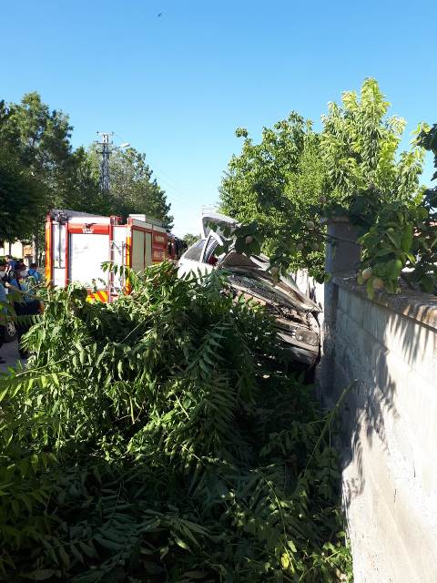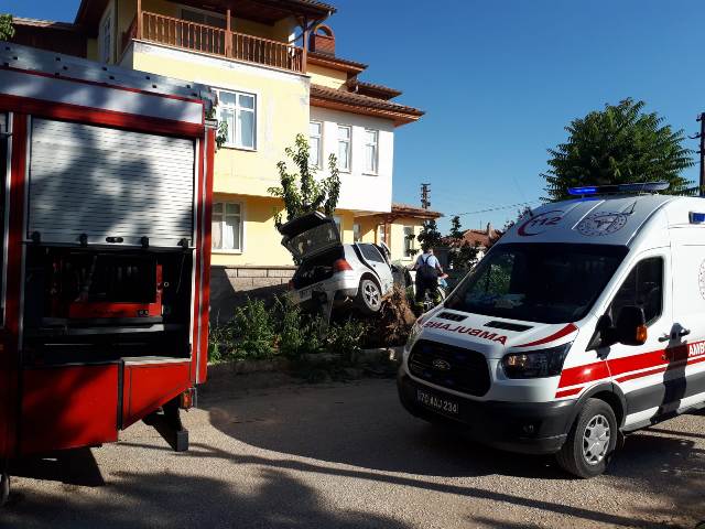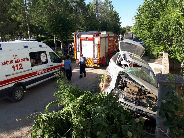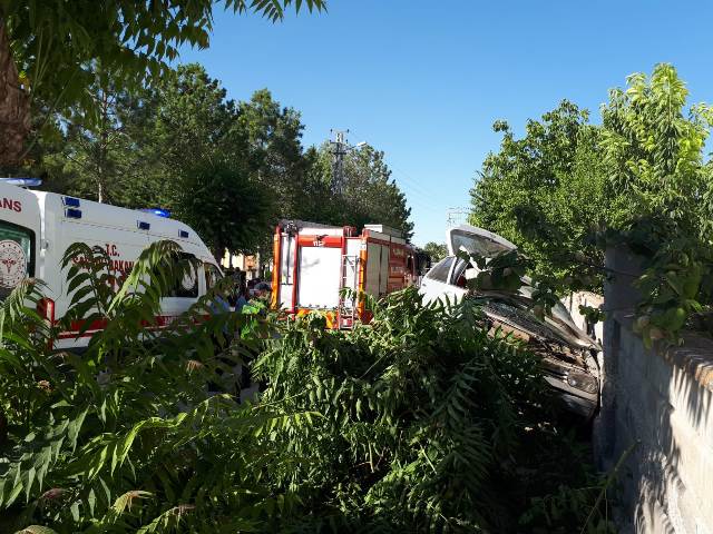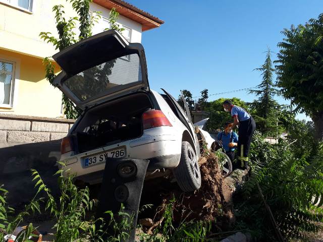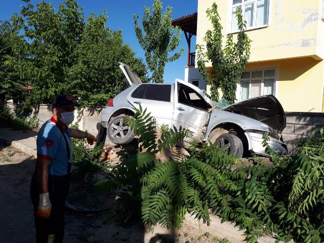 Kazada yoldan çıkan otomobil önce kalıdırıma çıkarak ağaçları devirdi, sonra bir evi bahçe duvarına çarparak durabildi.