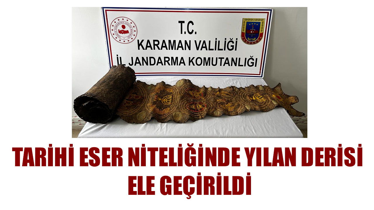 Karaman Cumhuriyet Başsavcılığı koordinesinde düzenlenen operasyonda, kente gelen şüphelinin otomobili durduruldu. Yapılan aramada Antik Mısır dönemine ait olduğu değerlendirilen 4 metre uzunluğunda, üzerinde İbranice yazıların bulunduğu piton derisi bulundu.