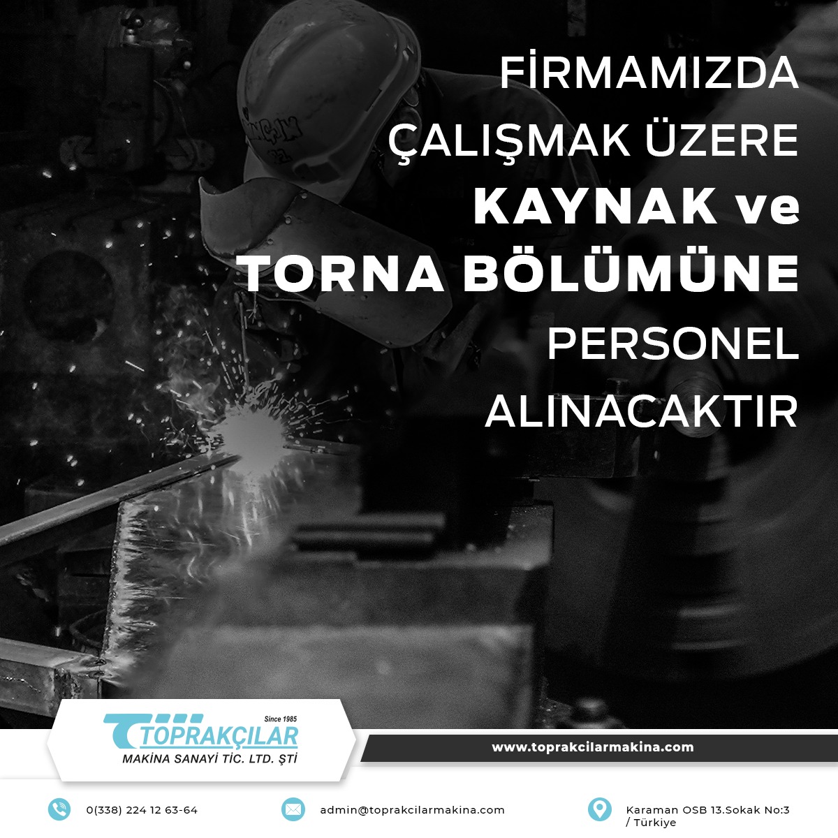 Karaman Organize Sanayi Bölgesinde faaliyet gösteren Toprakçılar Makina Sanayi ve Ticaret Limited Şirketinde kaynak ve torna departmanında çalıştırılmak üzere torna ve kaynakçı personeli alınacak.