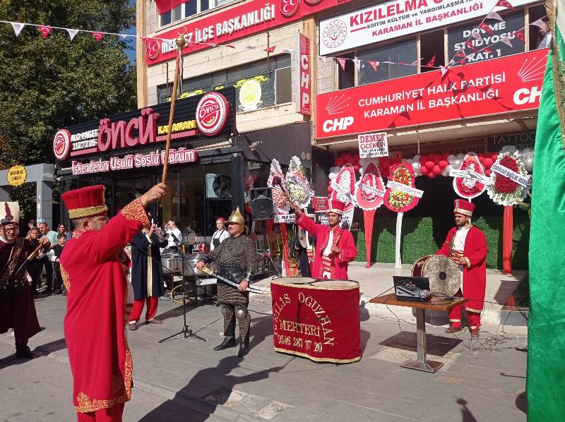 Kızılelma Derneği Genel Başkan Vekili Ahmet Sonkur ve Genel Başkan Yardımcısı Ahmet Yurtbaş'da katılımcılara teşekkür ederken, yapılan konuşmalar ve görkemli mehteran merasiminin ardından Karaman halkına açılışa özel etli pilav ikram edildi.