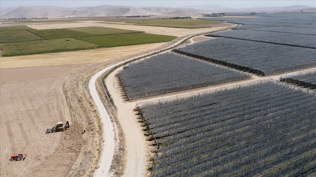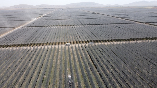 Bahar aylarında don olaylarına karşı onlarca pervanenin bulunduğu bahçenin üzerine serilen fileyle elma ağaçları doludan ve aşırı sıcaklardan korunuyor.
