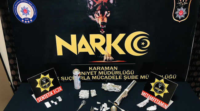 Karaman Emniyet Müdürlüğüne Bağlı Narkotik Suçlarla Mücadele Şube Müdürlüğünce yapılan operasyonda; U.E.,Y.T. ve A.Y. şahıslar üzerilerinde piyasaya sürdükleri uyuşturucu hap ve metamfetamin isimli uyuşturucu madde yakalandı.