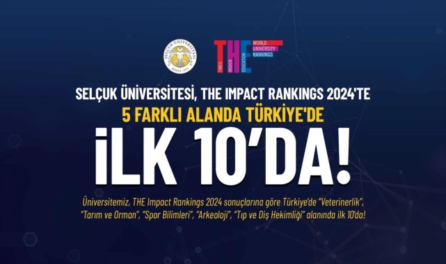 Selçuk Üniversitesi, "THE 2024 Üniversite Sıralaması"nda ise Türkiye'den 19'uncu sıraya yerleşti.Üniversite, THE Impact Rankings 2024 sonuçlarına göre, Türkiye'de "hukuk", "psikoloji", "ekonomi", "dil bilimi, edebiyat" ve "elektrik-elektronik mühendisliği" alanlarında da akademik başarısını sürdürdü.Selçuk Üniversitesi, hukukta 12, psikolojide 15, ekonomide 17, dil bilimi, edebiyatta 15, elektrik – elektronik mühendisliğinde ise 18'inci sırada yer aldı.Öte yandan, "Öğretim", "Araştırma Ortamı", "Araştırma Kalitesi" ve "Uluslararası Görünüm" kategorilerinde de başarı grafiği yükseldi.