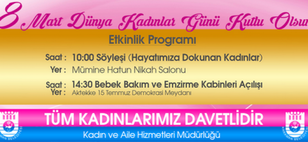 Karaman - Karaman Belediyesi Kadın ve Aile Hizmetleri Müdürlüğü, 8 Mart Dünya Kadınlar Günü dolayısıyla Karamanlı hanımlar için bir program tertip etti.Haber sitemizin edindiği bilgiye göre, Her yıl 8 Mart tarihinde kutlanan Dünya Kadınlar Günü, Karaman Belediyesi Kadın ve Aile Hizmetleri Müdürlüğü’nün düzenleyeceği etkinlik ile ilimizde de kutlanacak. İlk program; 8 Mart 2017 Çarşamba günü saat 10.00’da Mümine Hatun Nikâh Salonu’nda yapılacak olan “Hayatımıza Dokunan Kadınlar” isimli söyleşi ile başlayacak. Aynı gün saat 14.30’da ise Aktekke 15 Temmuz Demokrasi Meydanı’nda Bebek Bakım ve Emzirme Kabinlerinin açılışı gerçekleştirilecek.Karaman Belediye Başkanı Ertuğrul Çalışkan, 8 Mart Dünya Kadınlar Günü’nü kutlayarak, tüm Karamanlı hanımları etkinliklere katılmaya davet etti.