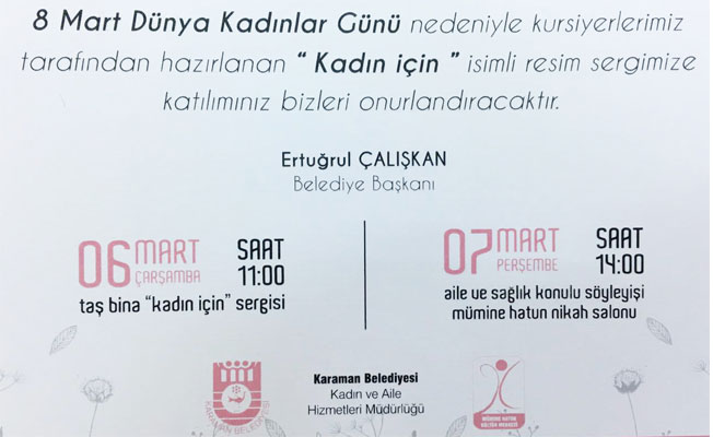 Karaman Belediye Başkanı Ertuğrul Çalışkan, tüm kadınların 8 Mart Dünya Kadınlar Günü’nü kutlayarak; 6 Mart 2019 Çarşamba günü saat 11.00’de Taş Bina’daki sergi açılışına ve 7 Mart 2019 Perşembe günü saat 14.00’de Mümine Hatun Nikah Salonu’ndaki söyleşi programına Karamanlı hanımları davet etti.