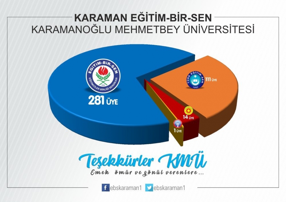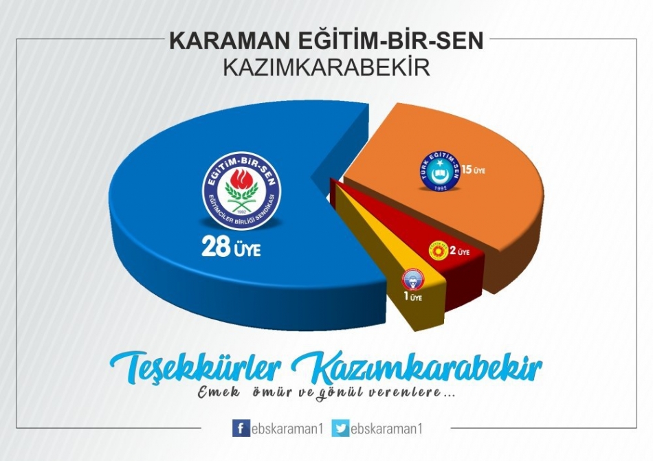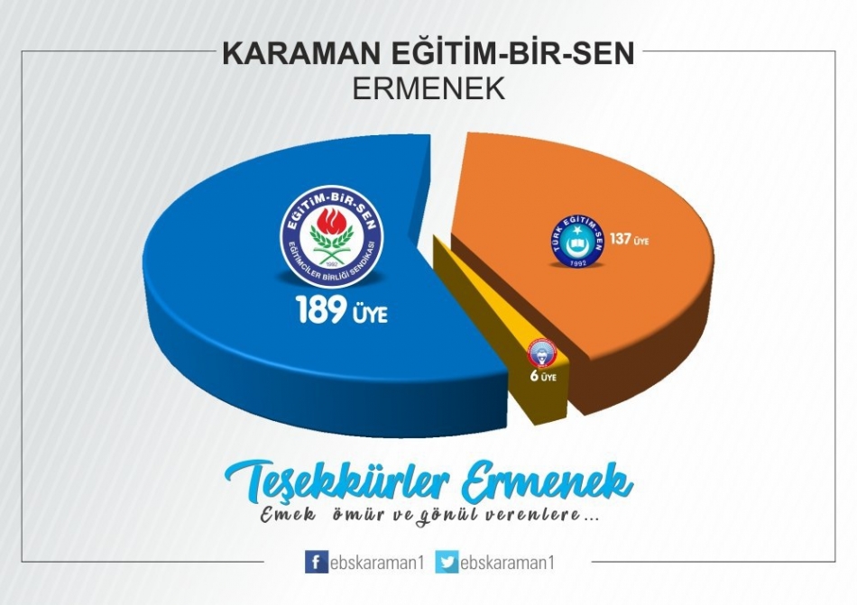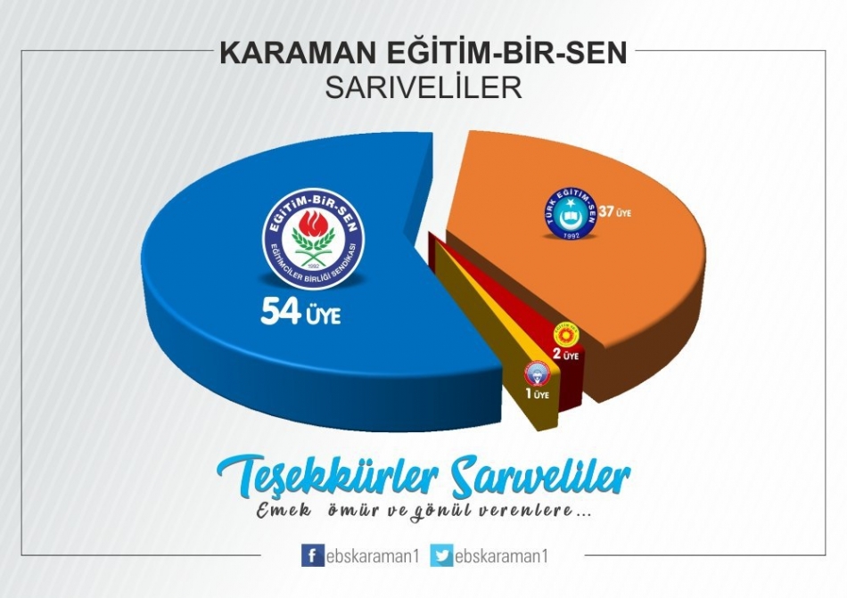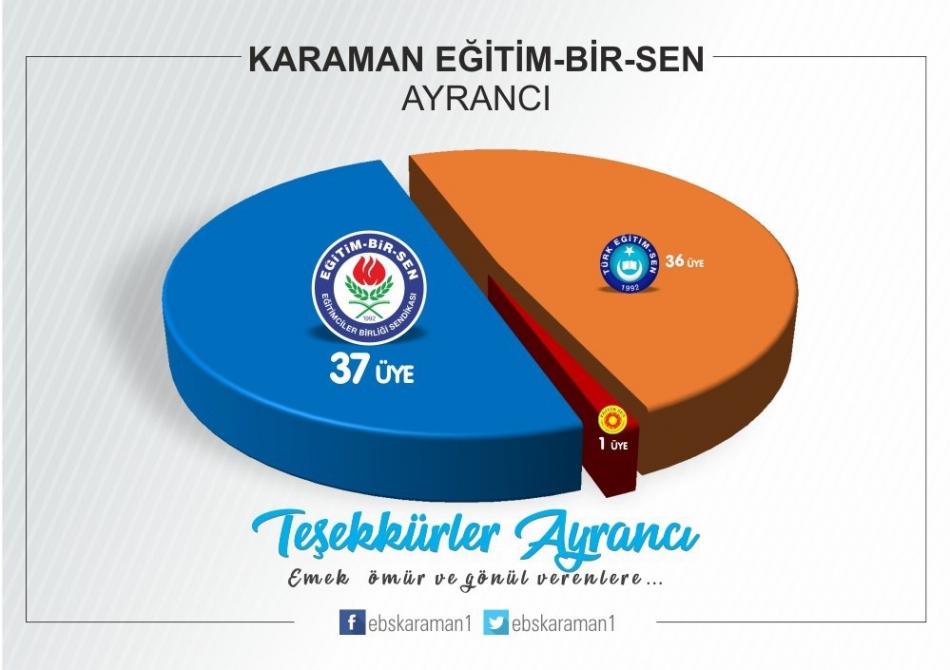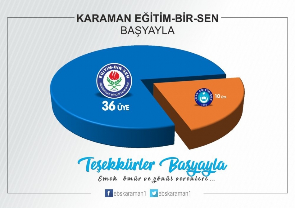 “İlimizde ve Türkiye’de eğitim çalışanlarının tercihi yeniden Eğitim-Bir-Sen oldu. Bu yıl da eğitim camiasının teveccühü ile üye sayısını artırarak hatta en yakın rakibini ikiye katlayarak Karaman’da ve Türkiye’de genel yetkili sendika Eğitim-Bir-Sen oldu.