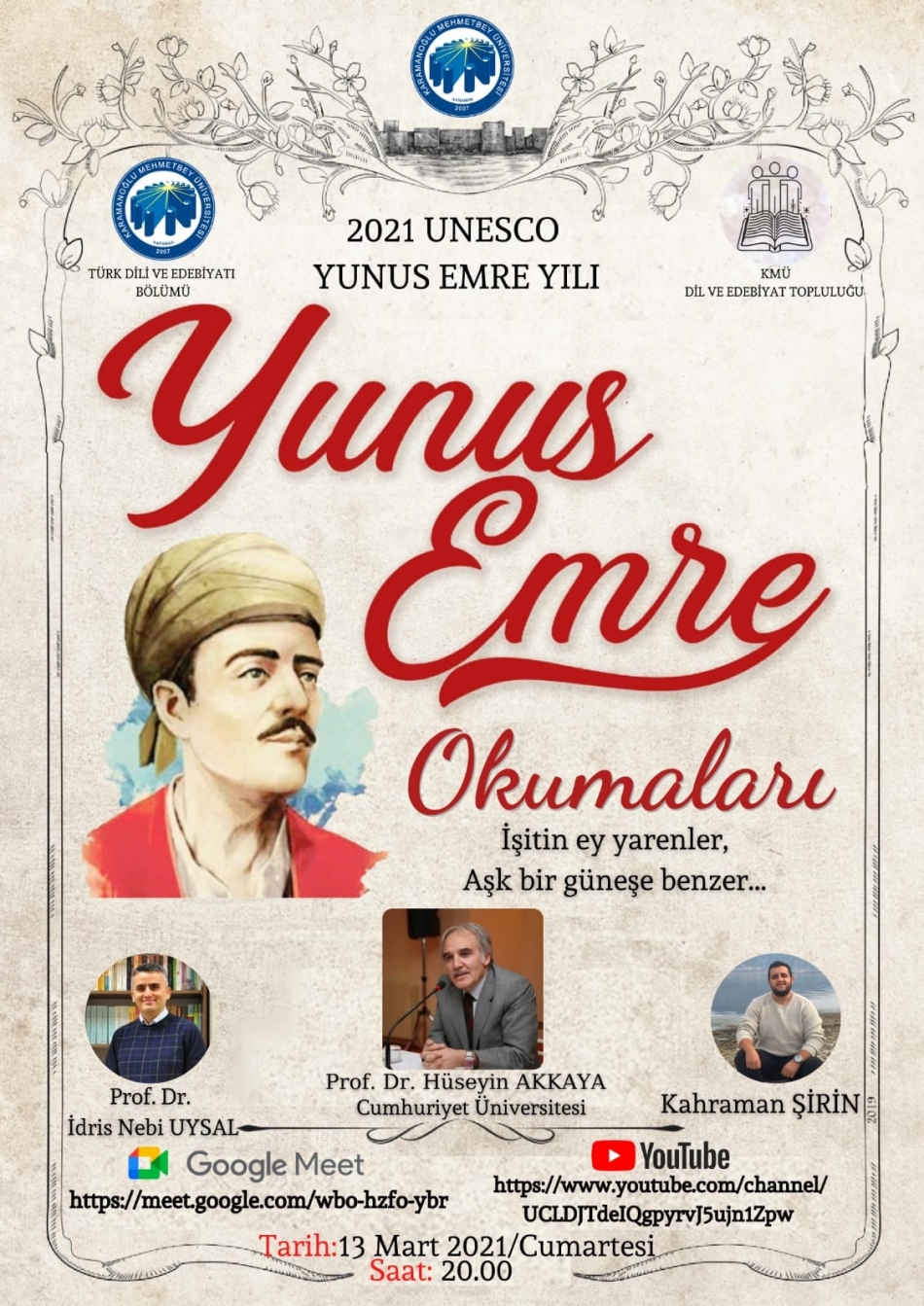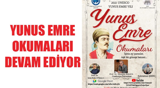 KMÜ Edebiyat Fakültesi Türk Dili ve Edebiyatı Bölümü ile Dil ve Edebiyat Topluluğu’nun birlikte düzenlediği “Yunus Emre Okumaları”nın üçüncü programı 13 Mart 2021 Cumartesi günü saat 20:00’de yapılacak. İki hafta arayla yapılması planlanan okumaların ilki 13 Şubat’ta Prof. Dr. İdris Nebi Uysal’ın, ikincisi 27 Şubat’ta Prof. Dr. Turan Karataş’ın yöneticiliğinde icra edilmişti.